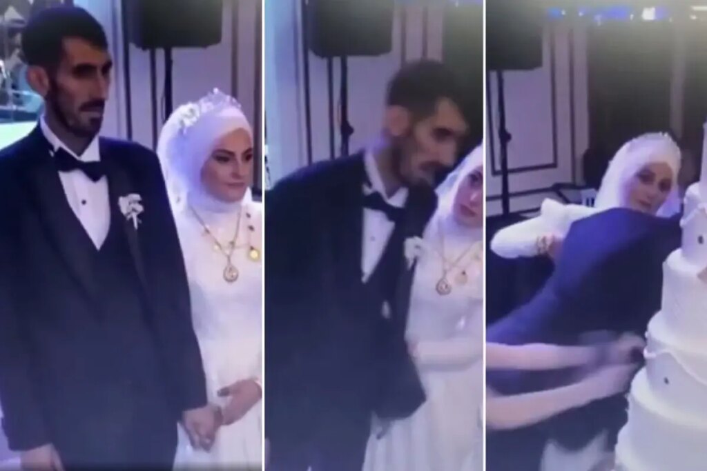 Gelin ve damadın davetliler eşliğinde sahneye çıkarak düğün pastasını kestiği sırada damadın birdenbire istikrarını kaybettiği görüldü. Cep telefonuyla kaydedilen manzaralarda, damadın pastanın üzerine yanlışsız devrilmek üzereyken etrafındakilerin müdahalesiyle son anda tutulduğu anlar yer aldı. Yere yığılmak üzere olan damadı, gelini ve yakınları zahmetle ayakta tuttu.