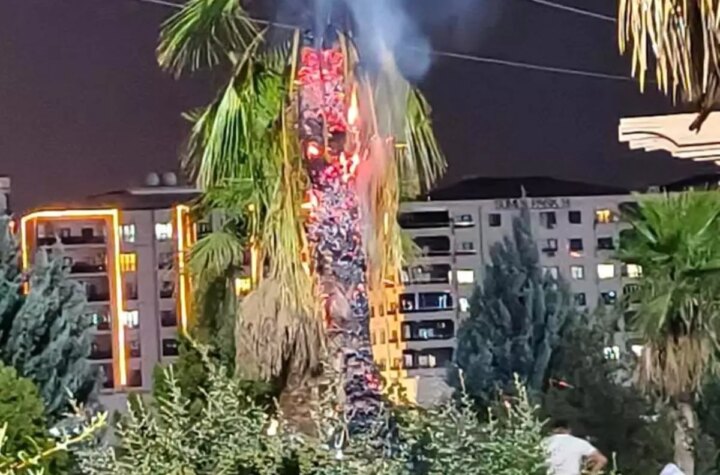 Mardin'in Kızıltepe ilçesinde TOKİ Büyük Park'ta kimliği meçhul şahıslarca ateşe verilen palmiye ağacı büsbütün...