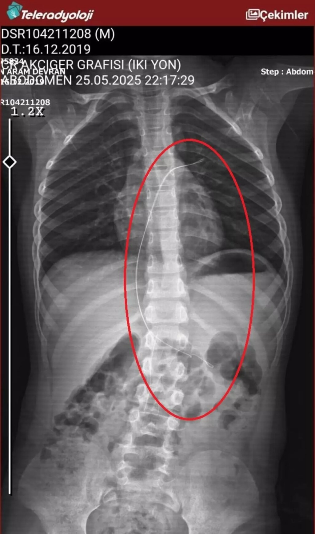 Şırnak’ta yaşayan Semra (37) ve Mehmet Ötün (40) çiftinin oğulları Aram Devran Ötün, mayıs ayında piknikteyken salatalık modülü yuttuktan sonra öksürük ve kusma şikayetleri görülünce Şırnak Devlet Hastanesi’ne götürüldü. Burada çekilen röntgen ve MR’da Aram’ın bedeninde kateter unutulduğu görüldü. Diyarbakır’daki Gazi Yaşargil Eğitim ve Araştırma Hastanesi Bayan Doğum ve Çocuk Ek Binası’na sevk edilen Aram, 5,5 saat süren riskli bir ameliyata alınarak 18 santimetre uzunluğundaki kateter çıkarıldı. Ameliyat sonrası yapılan incelemelerde kateterin kalp kapakçığına ve ciğerlerine ziyan verdiği belirlendi.